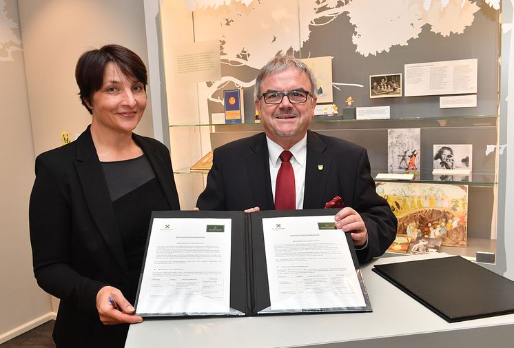 Claudia Baer (Komplementärin der Wendt & Kühn KG) &Landrat Frank Vogel (Vorsitzender Tourismusverband Erzgebirge e.V) besiegeln Fortführung der Kooperation