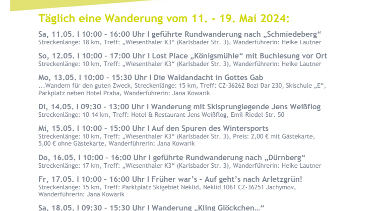 Vom 11. bis 19. Mai 2024 lädt die Gästeinformation Kurort Oberwiesenthal alle Wanderfreunde herzlich zur Frühjahrs-Wanderwoche ein. In diesem Zeitraum wird täglich eine geführte Wanderung angeboten.