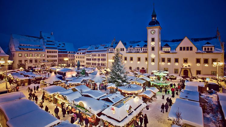 Als erster und längster Weihnachtsmarkt öffnet der Freiberger Christmarkt am letzten Dienstag dieses Monats, am 27. November, seine Tore zum 29. Mal auf dem Obermarkt. Ganze 27 Tage präsentiert sich einer der schönsten Weihnachtsmärkte Deutschlands seinen Besuchern. Erst am 23. Dezember schließt er - wenn Bergknappe Daniel traditionell mit dem Schlagen der Hilligerglocke die Weihnachtsruhe einläutet.