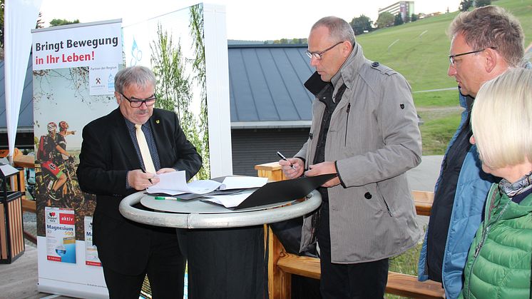 Auch Roland Stauder, Vater und Ideengeber der Marke Stoneman, war zur Vertragsunterzeichnung vor Ort und zeigte sich vom Engagement aller beteiligten Partner begeistert, das Leitprodukt Stoneman Miriquidi und das Erzgebirge als Aktivregion damit noch stärker in Szene zu setzen.